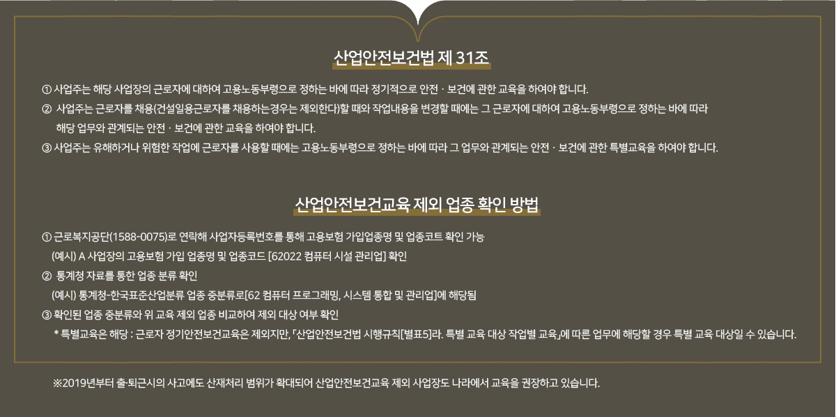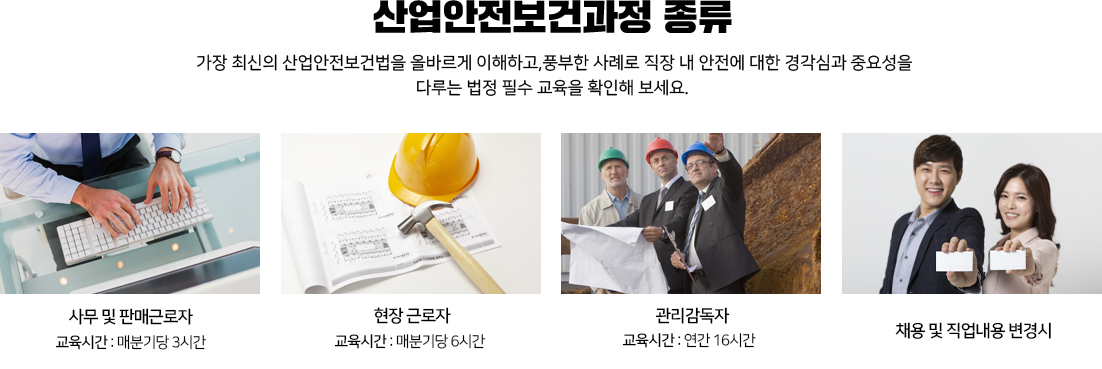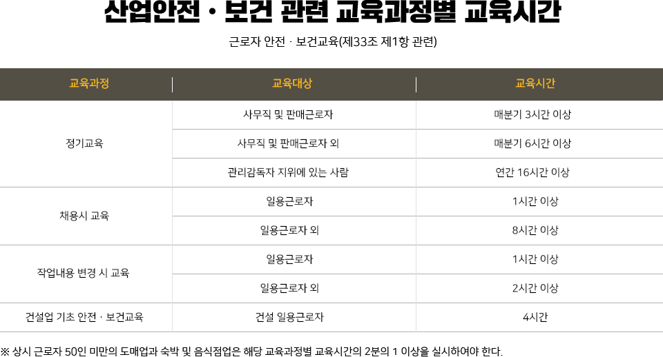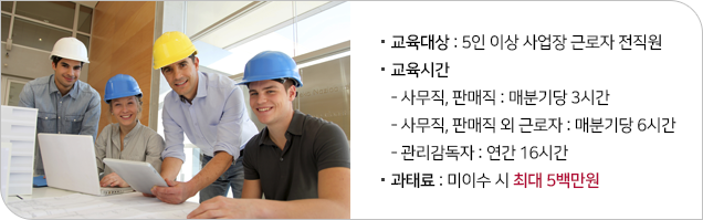 안전보건교육은 5인 이상 사업장의 모든 근로자가 매분기 3~6시간 반드시 이수해야 하는 법정의무교육입니다. 「산업안전보건법」 제 3조에 따라 매분기 이수하지 않을 시 최대 500만원 이하의 과태료가 부과됩니다.